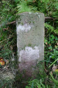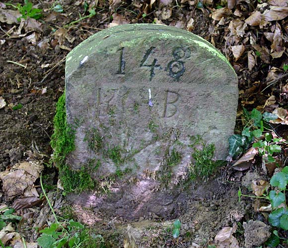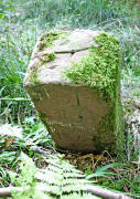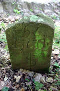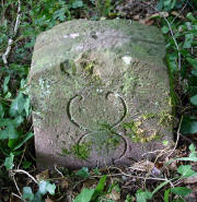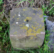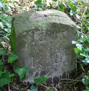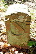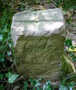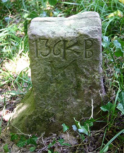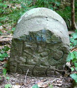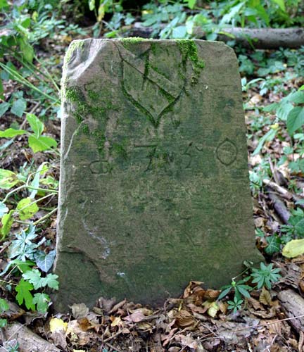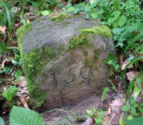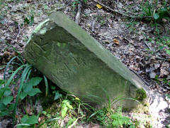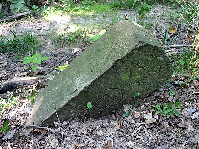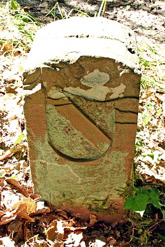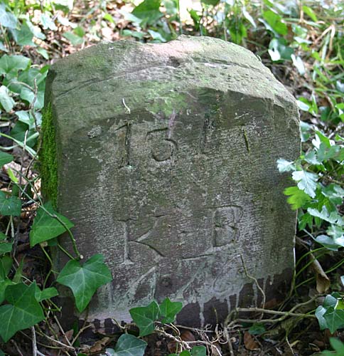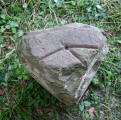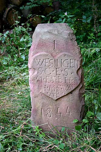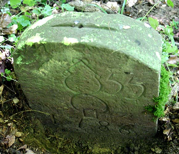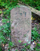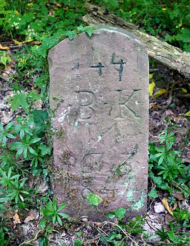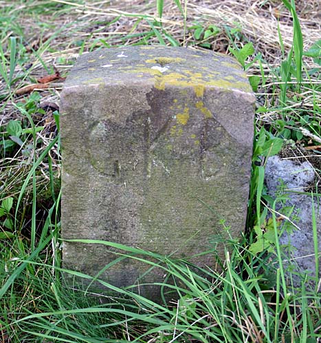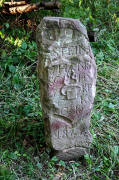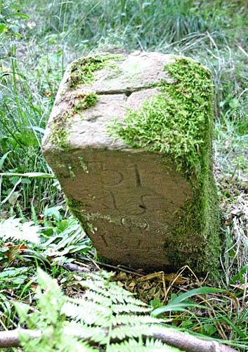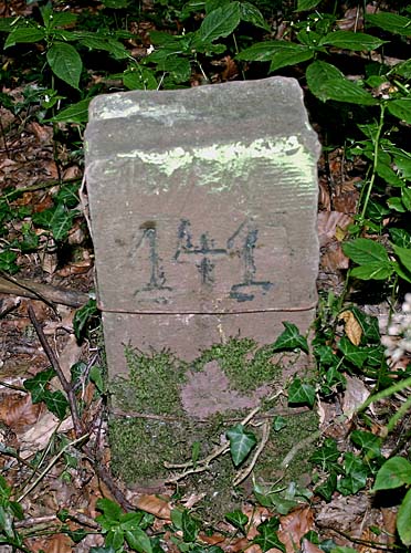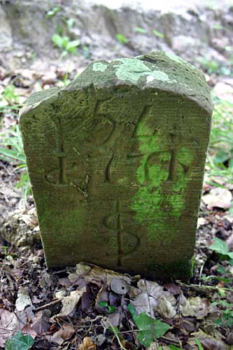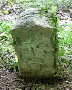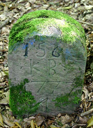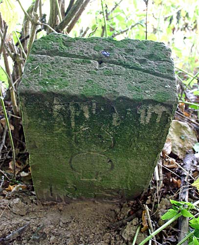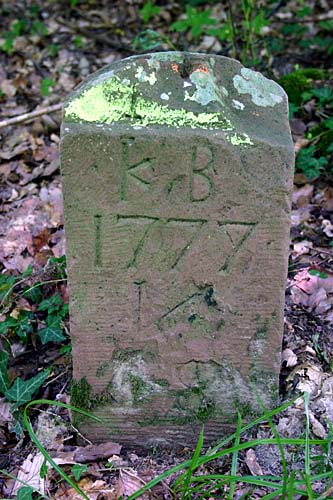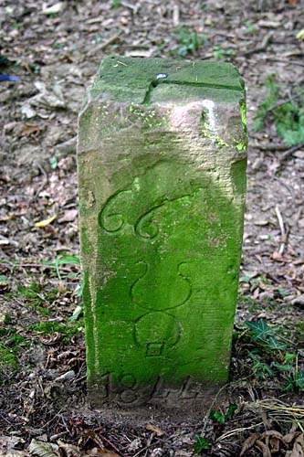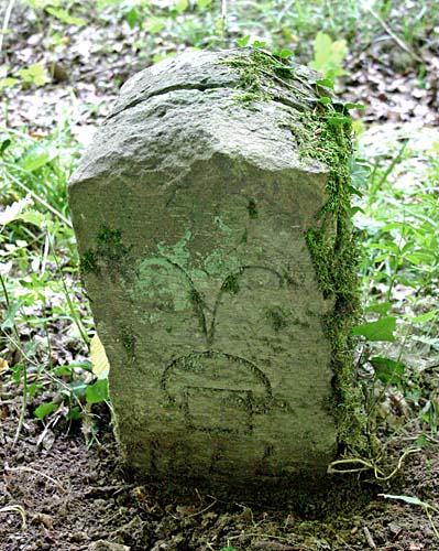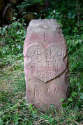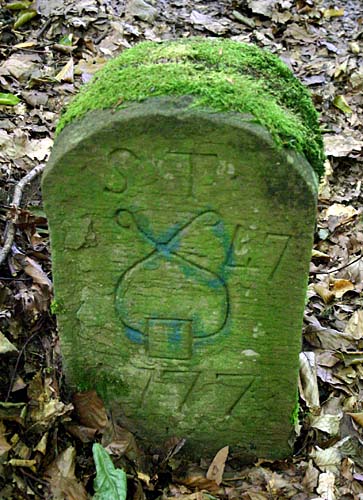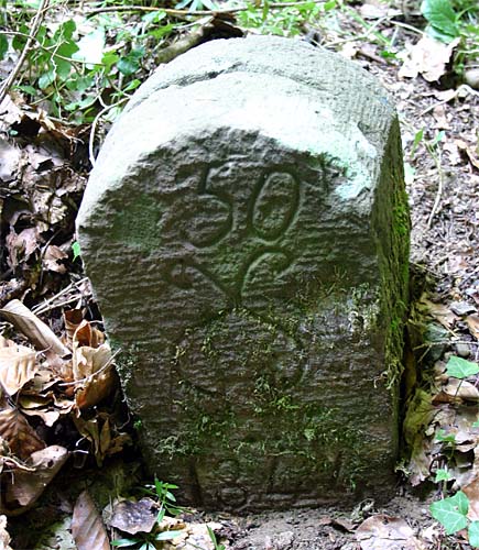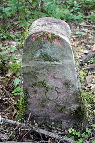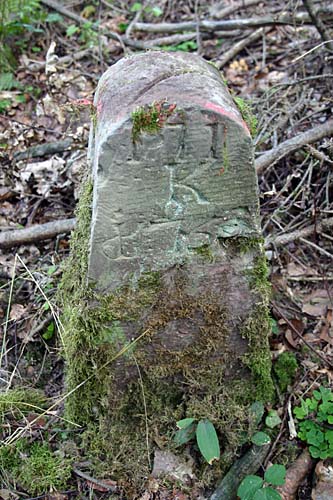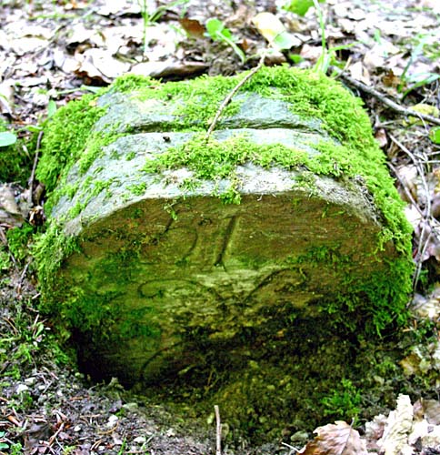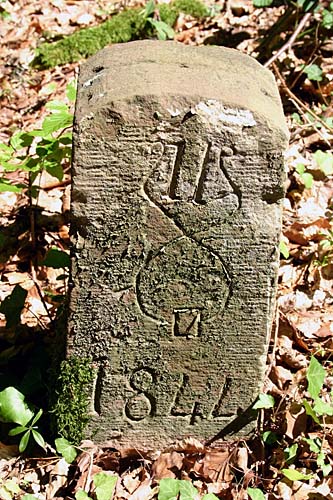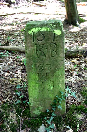 auf dem Kopf des Grenzsteines ist der recht-winklig abknickende Verlauf der Grenze eingemeißelt |