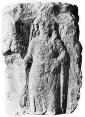 Foto Merkur (30889 Byte) Ein Relief aus rotem Sandstein, 70 cm hoch, eingemauert an der Südostseite des Chores der Kirche. 1912 wurde der Stein herausgebrochen und erwies sich als ein römischer "Viergötterstein".